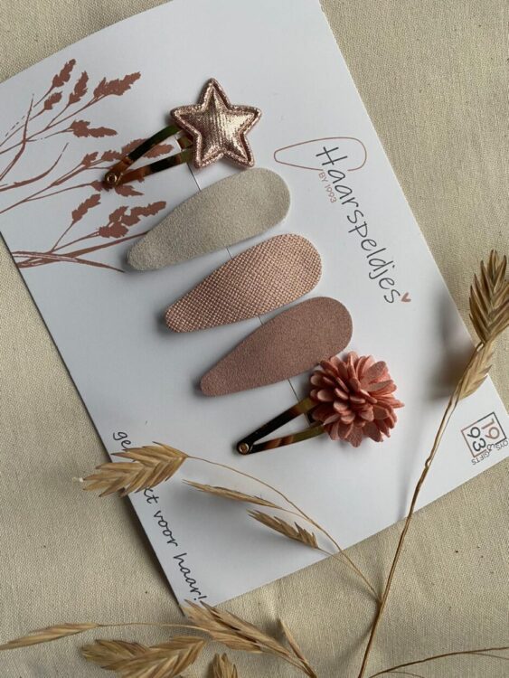 Deze haardspeldjes worden met veel liefde stuk voor stuk met de hand gemaakt. Dit setje “Djoy” bestaat uit vijf haarspeldjes, elk met een eigen nude of oud roze tint.